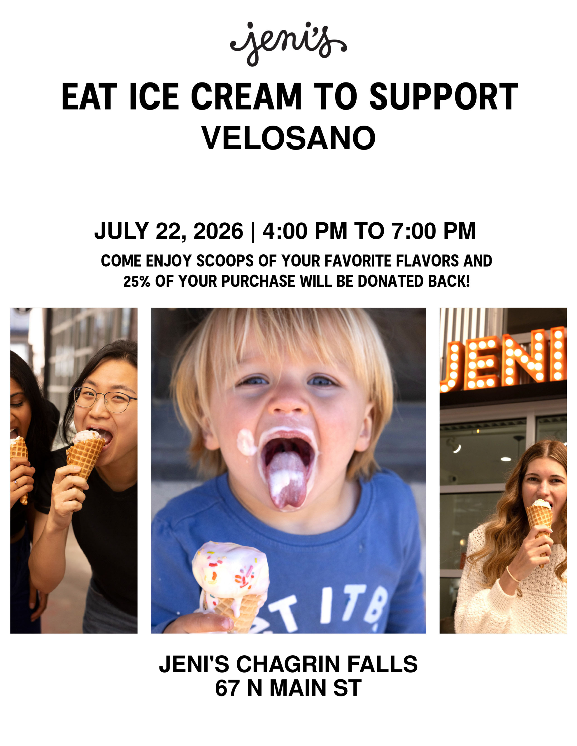 All you have to do is come in for some ice cream!! Jeni’s will donate 25% of all in-store sales (including scoops, pints, and merchandise) during the time of the event back to our VeloSano Team! This includes sales from guests outside your community (meaning guests don’t need to present a flyer or mention your organization at the register). We do this so that every purchase during your event directly supports your cause.